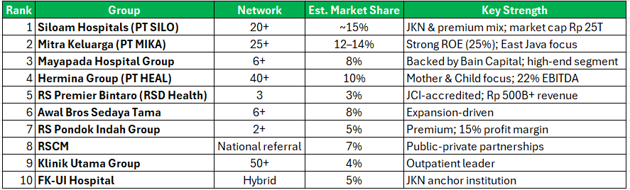 Urbanization (56% by 2025) and greenfield projects in Java/Sumatra yield 15–20% ROI (Map Resources Indonesia).5. Market Leaders: Top 10 Hospital Players (2025 Outlook)