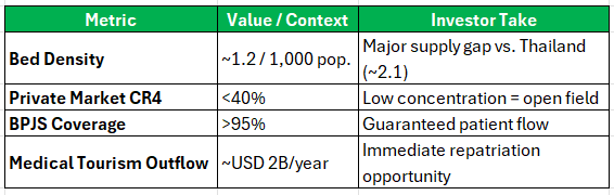 Indonesia once lost USD 1+ billion/year to outbound medical tourism (Trade.gov). Now, that flow can stay domestic.The Nuance: