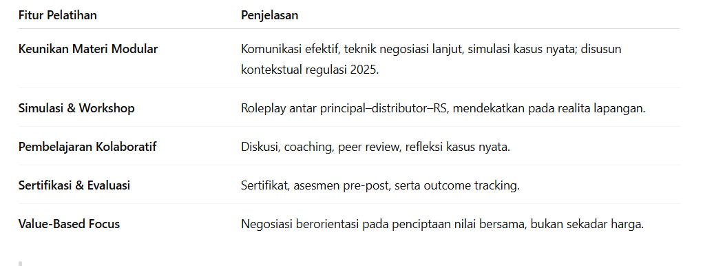 Format ini menghasilkan SDM yang memahami negosiasi strategis, adaptif terhadap multi-pihak, dan berani membawa nilai tambah di setiap interaksi bisnis.