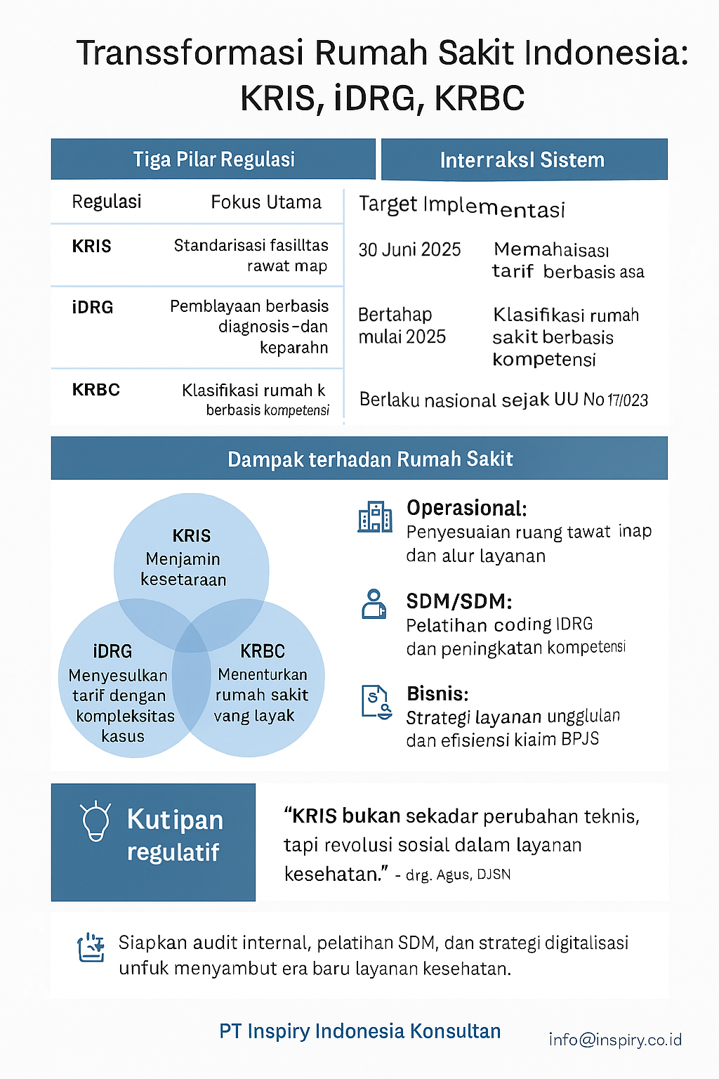 #KRIS2025 #iDRGIndonesia #KRBC #ReformasiKesehatan #BPJSKesehatan #RumahSakitIndonesia #InspiryKonsultan #InspiryConnection #TransformasiLayananKesehatan #ManajemenRS #KesehatanNasional #DigitalisasiRS #TransformasiKesehatan #BPJS2025 #KRISIndonesia #MedTechIndonesia #InspiryIndonesia #HospitalStrategy #DigitalHealth #HealthcareLeadership #KesehatanBerkeadilan #ValueBasedCare #ISOHealthcare #SDMKesehatan #ClinicalPathway #HealthcareInnovation